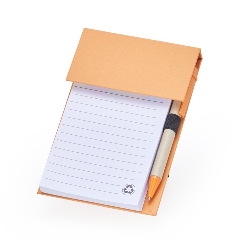 Bloco de anotações ecológico com caneta, feito em kraft com 6 blocos autoadesivos coloridos com aproximadamente 20 folhas e bloco com aproximadamente 100 folhas brancas com pauta. Possui porta caneta elástico e acompanha caneta de papelão e detalhes plásticos, carga esferográfica azul 1.0mm e acionamento por clique.