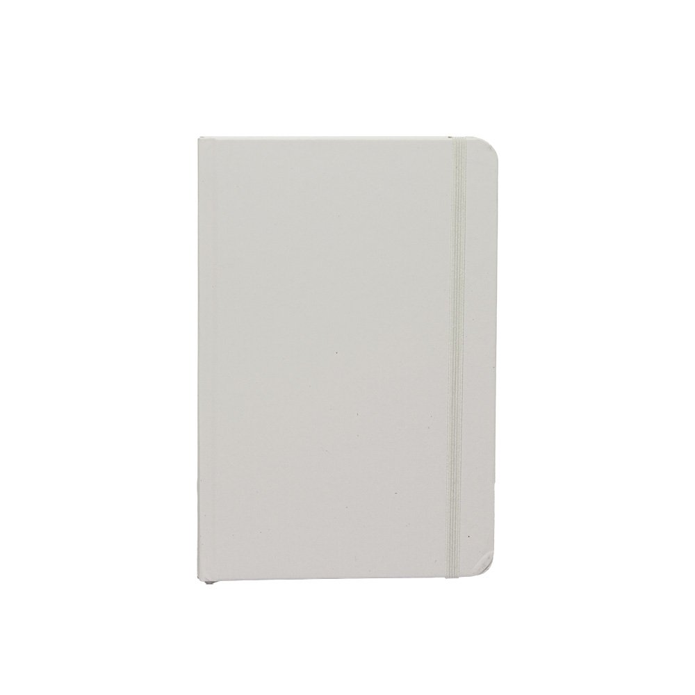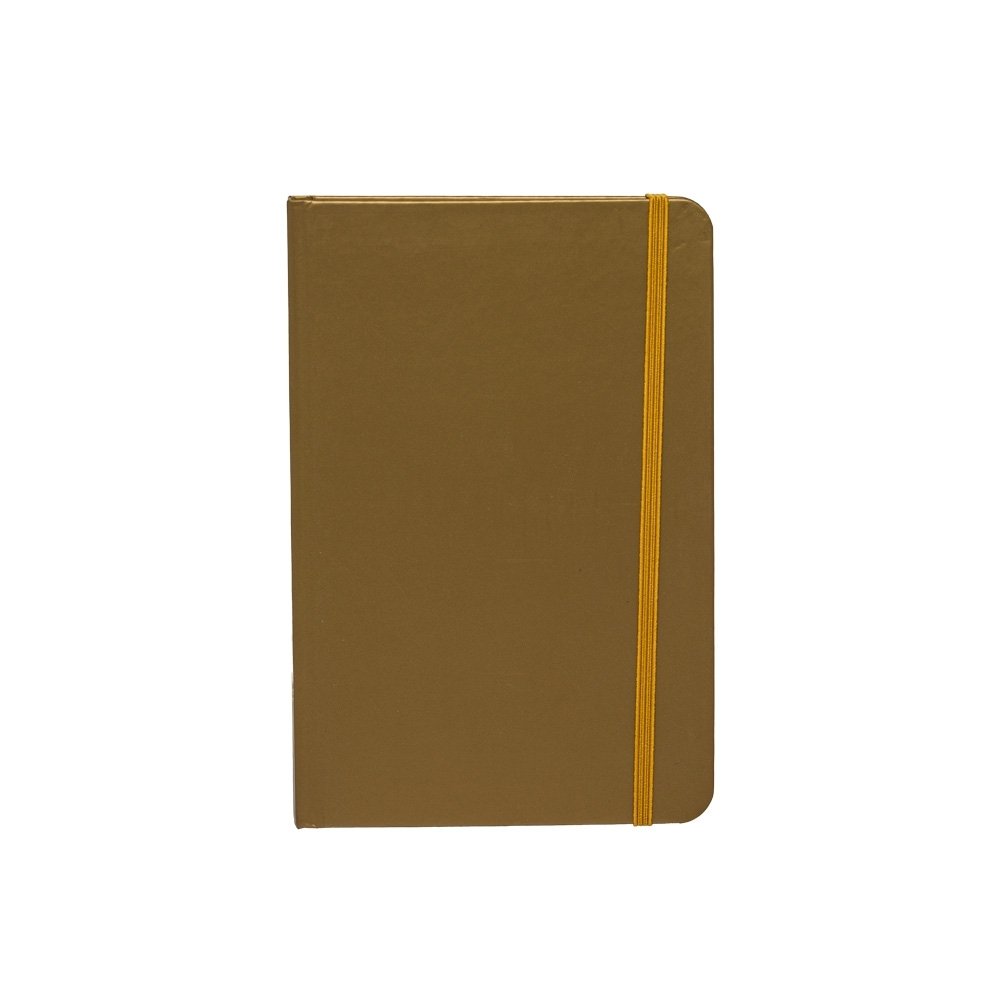 Caderneta de papel couchê, contém aproximadamente 72 folhas amarelas com pauta e 16 folhas sem pauta, marcador de página em cetim, elástico para lacre e compartimento em papel para documentos ou anotações.