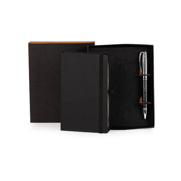 Caderneta para anotações com caneta. A caderneta conta com 80 folhas não pautadas, suporte para caneta e elástico para fechamento. Caneta em metal / material sintético, carga esferográfica azul acionada com um giro no corpo da caneta.