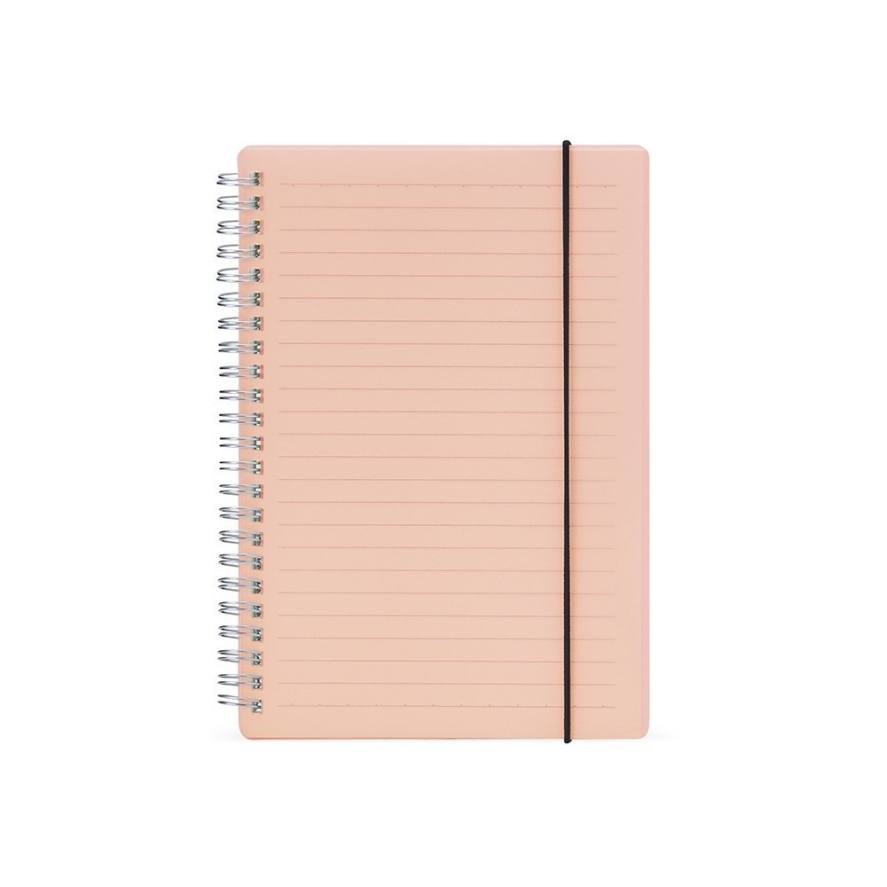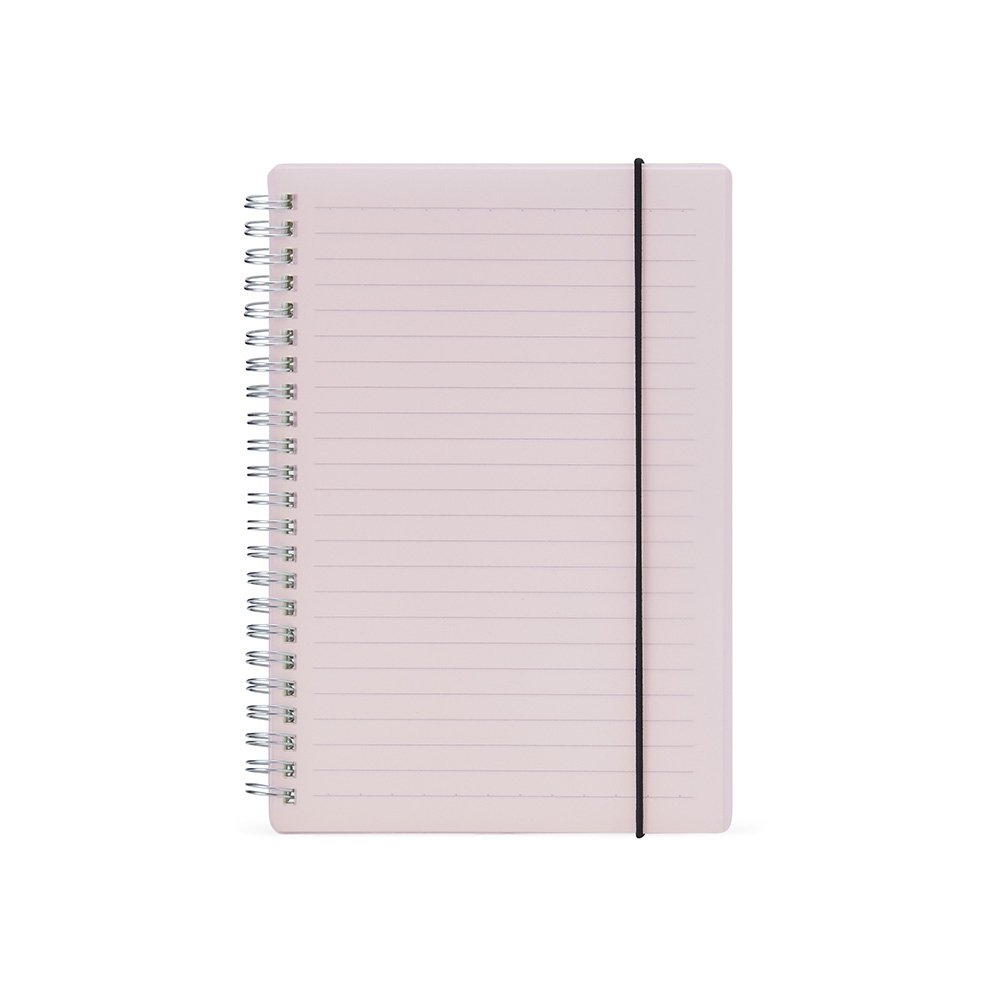 Caderno A5 com capa plástica e elástico para lacre, contém aproximadamente 80 folhas marfim com pauta.