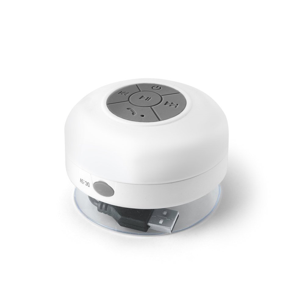 Caixa de som, com microfone, à prova de água em ABS com acabamento emborrachado com ventosa. transmissão sem fios BT v5’0 e potência de 3W/4Ω. Autonomia aproximada de 3 h. Função para atender chamadas, controle de volume e conexão à playlist do dispositivo móvel. Incluso cabo para carregamento. Fornecida em caixa presente. ø85 x 50 mm | Caixa: 88 x 88 x 55 mm