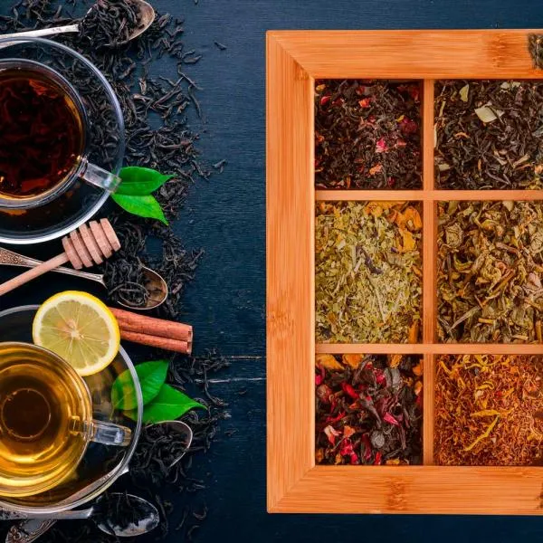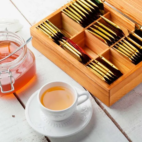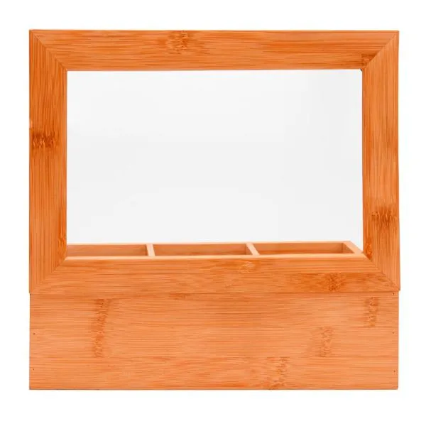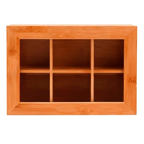 Caixa para chás em bambu/Poliestireno. Possui 6 divisões e tampa com visor em Poliestireno. Não acompanha chás.
