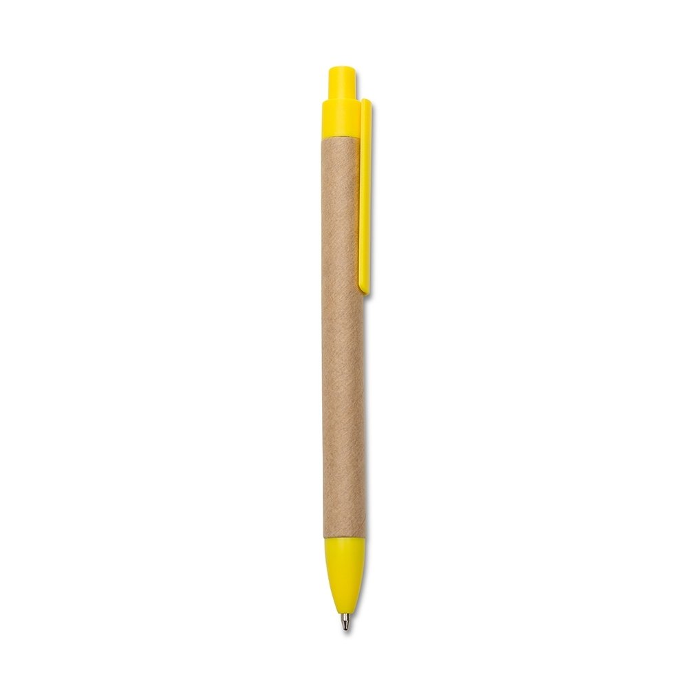 Caneta de papelão com detalhes plásticos, carga esferográfica azul 1.0 mm e acionamento por clique.