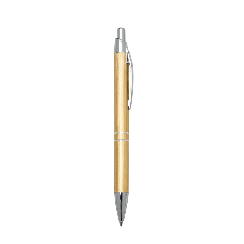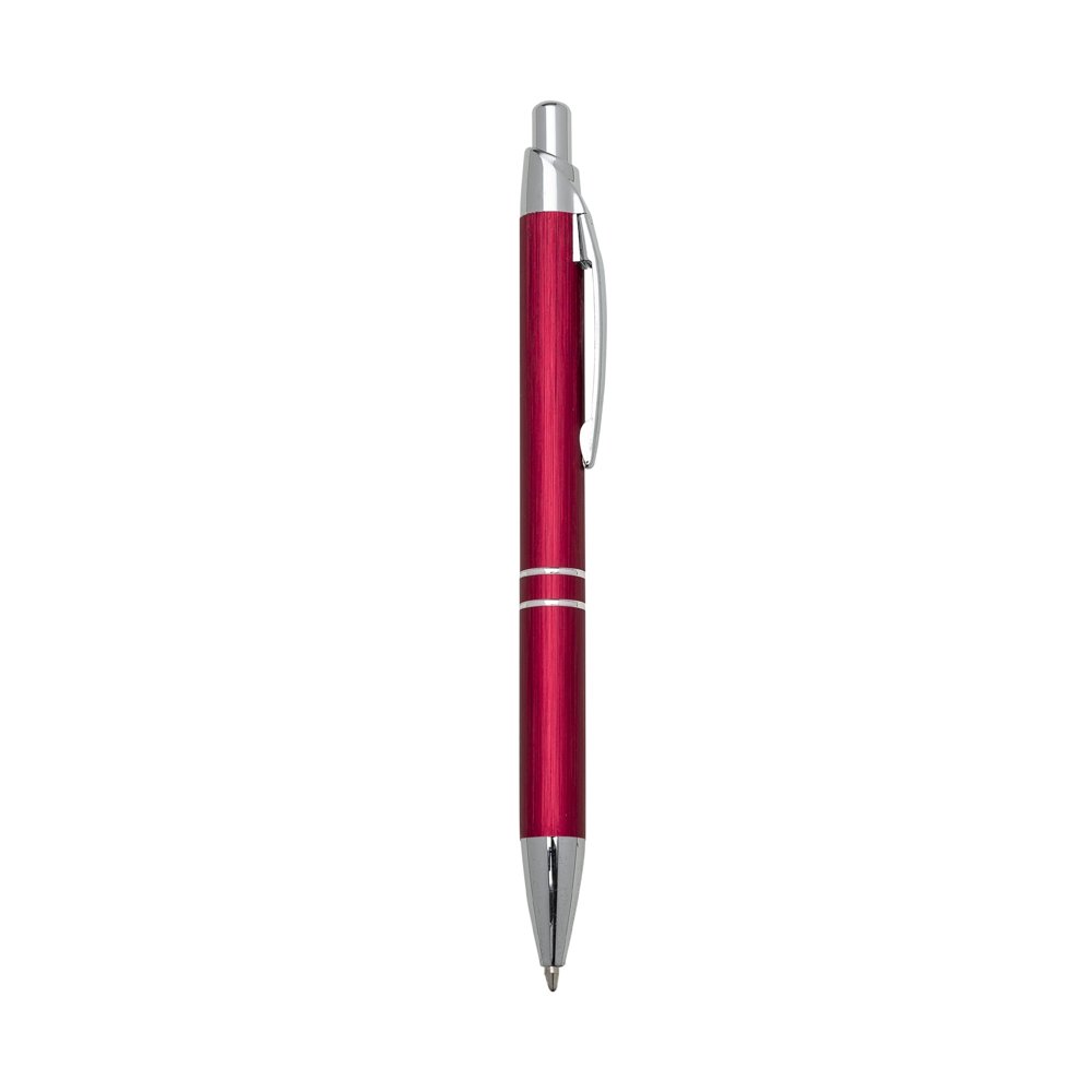 Caneta metálica com carga esferográfica azul e acionamento por clique.