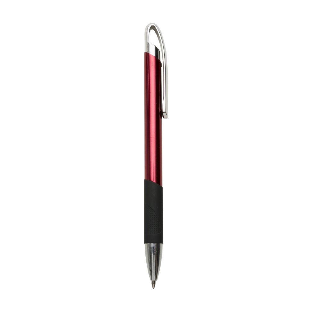 Caneta metálica com detalhe emborrachado, carga esferográfica azul e acionamento por clique.