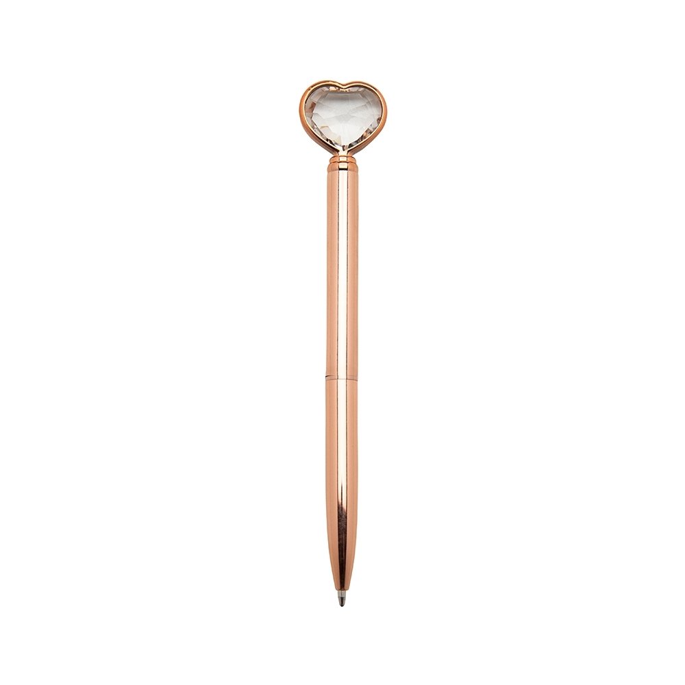 Caneta metálica com carga esferográfica azul e acionamento por rotação.