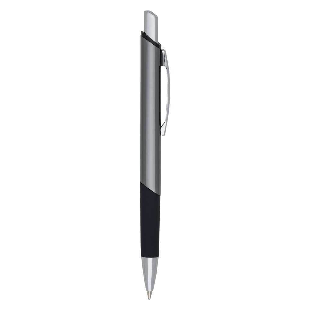 Caneta metálica com design quadrangular, acabamento brilhante (exceto a prata) e detalhe emborrachado, carga esferográfica azul e acionamento por clique.