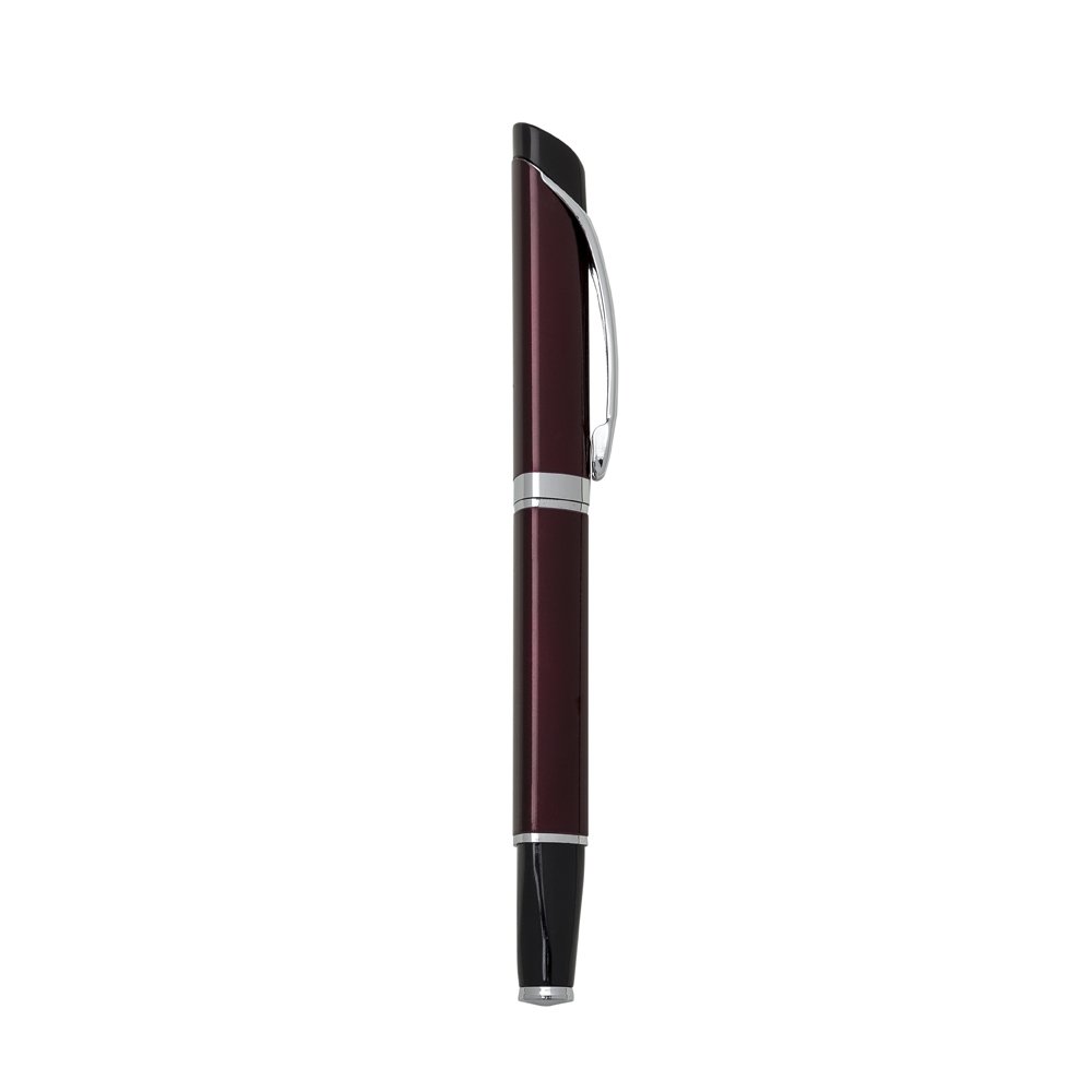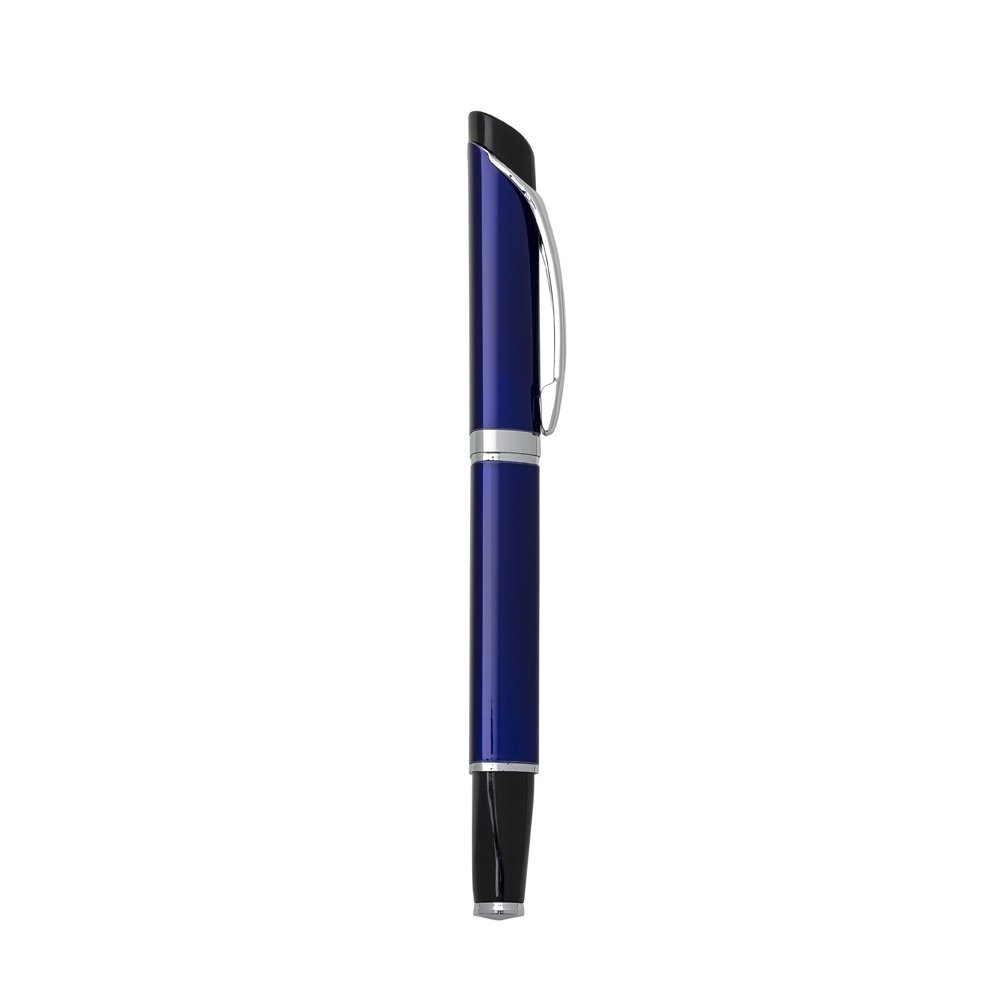 Caneta metálica triangular com tampa, carga esferográfica azul.