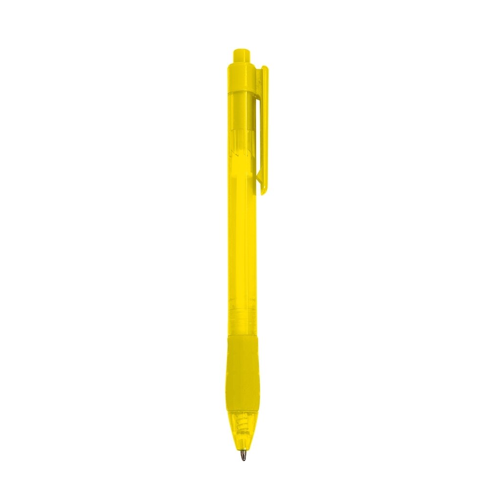 Caneta plástica com detalhe emborrachado, carga esferográfica azul e acionamento por clique. OBS.: PEDIDOS MÍNIMO DE 50 PEÇAS!