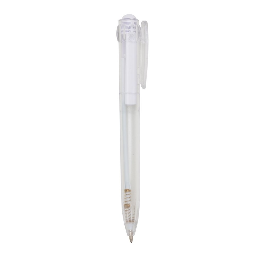 Caneta plástica com carga esferográfica azul 1.0mm, acionamento por clique.