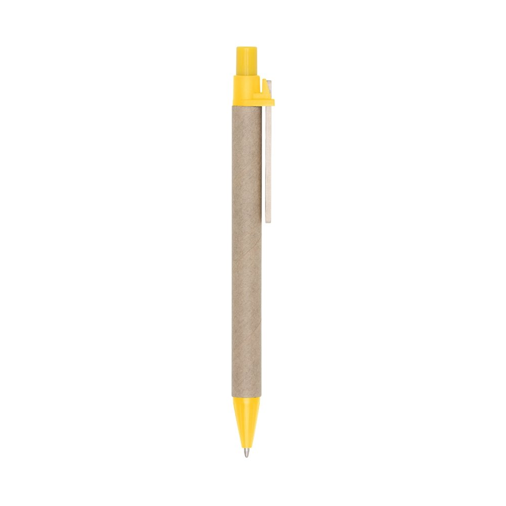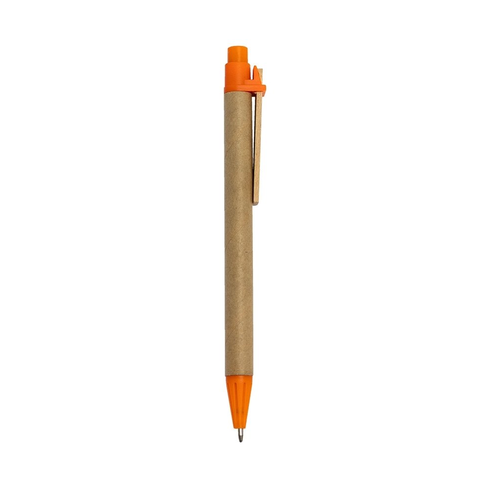Caneta ecológica de papelão com detalhes coloridos. Possui carga esferográfica azul 1.0 mm, clip de madeira e ponteira plástica com relevo. Acionamento por clique.