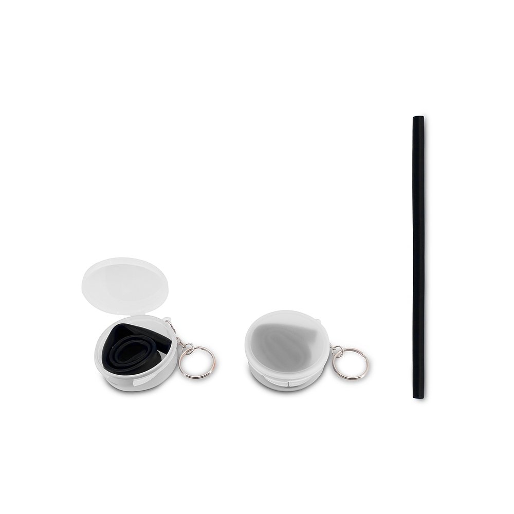 Canudo flexível de silicone em estojo plástico fosco com chaveiro.