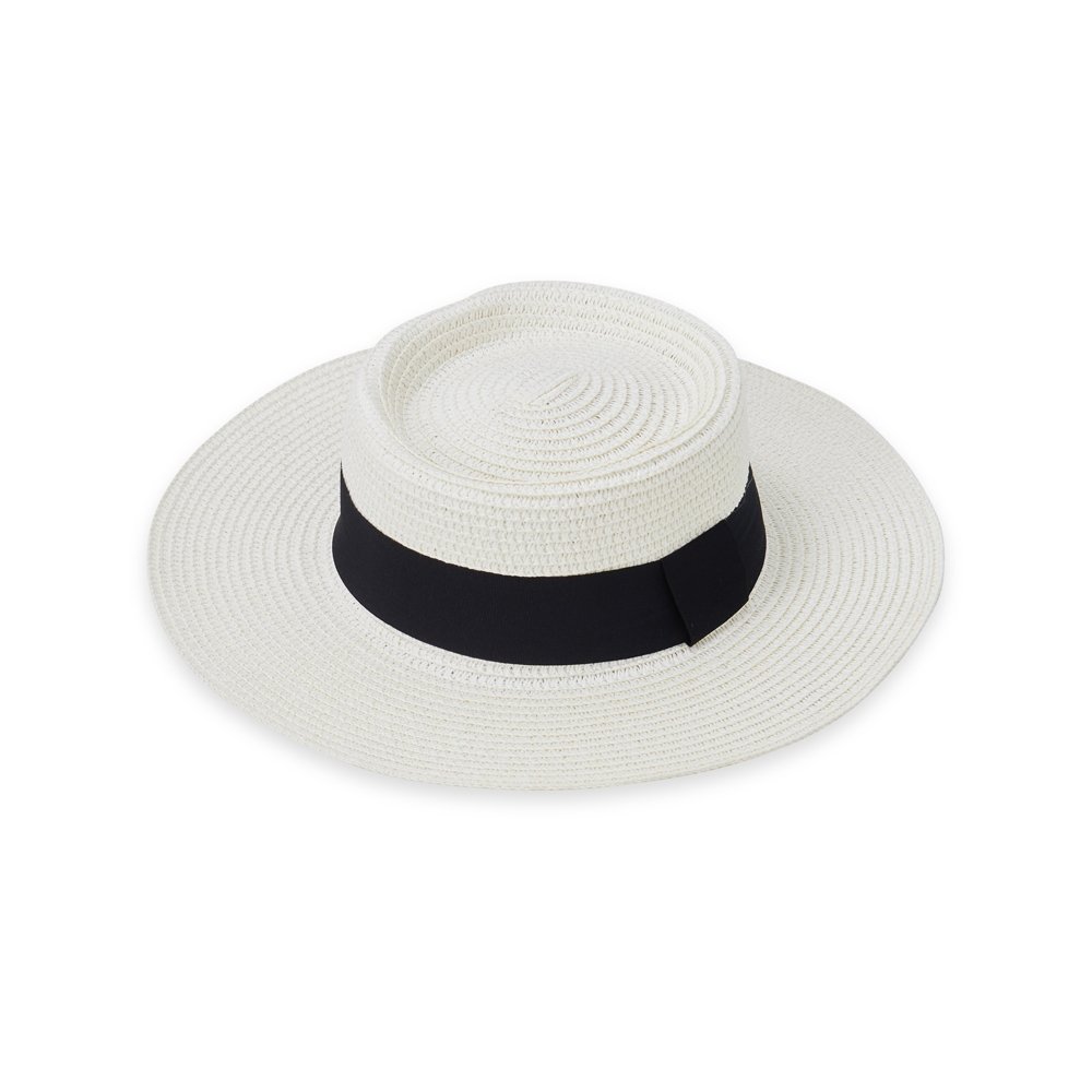 Chapéu de palha com aba levemente ondulada e faixa de poliéster fixa, feito em tamanho único com ajuste interno.