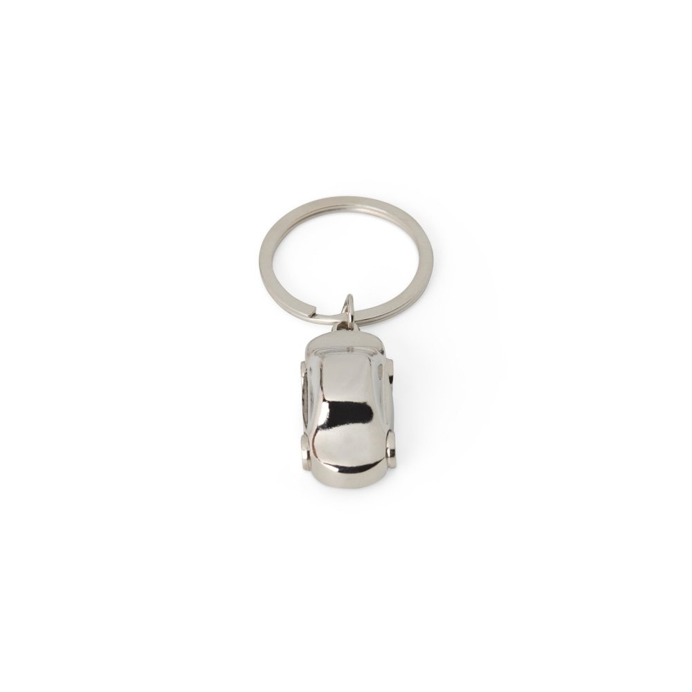 Este é um chaveiro brilhante, feito em metal com formato de carro e argola em ferro, adequado para organizar chaves ou também como objeto decorativo.