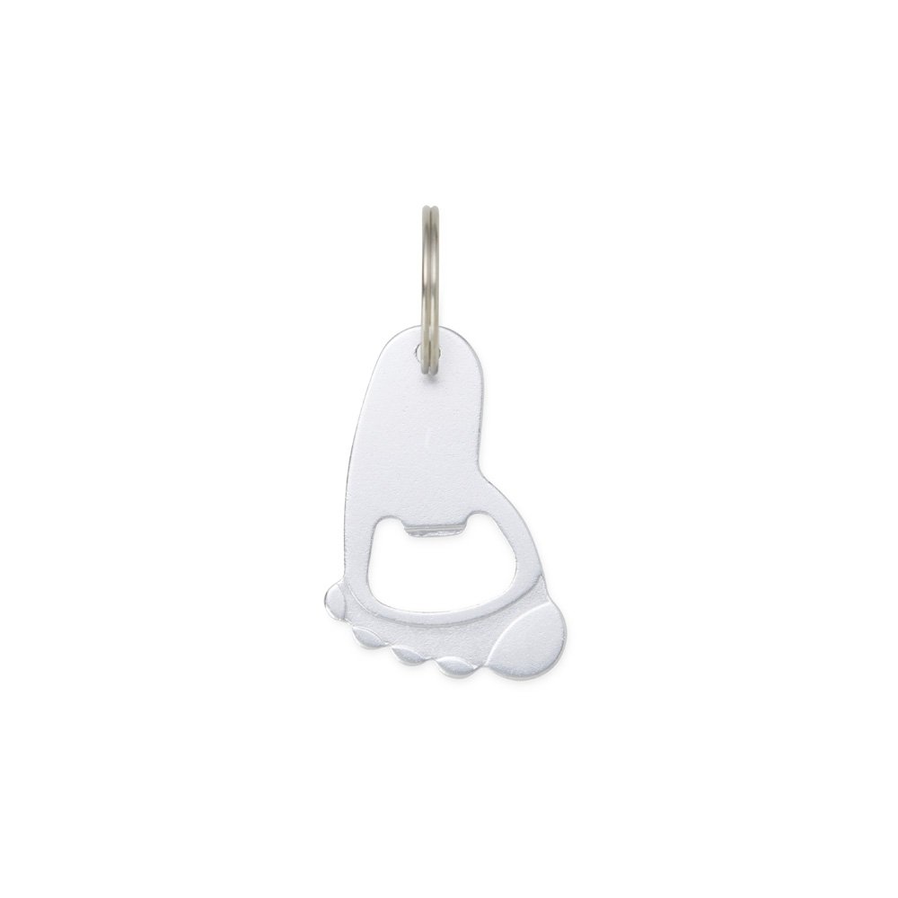 Um chaveiro abridor de garrafas feito em metal com um formato que lembra um pé e argola metálica.