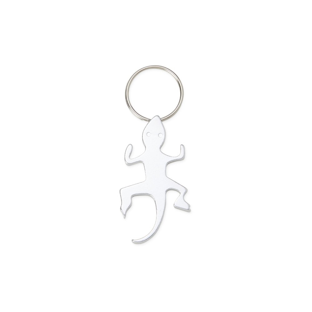 Chaveiro abridor metálico com construção leve e formato descontraído que remete a um lagarto.