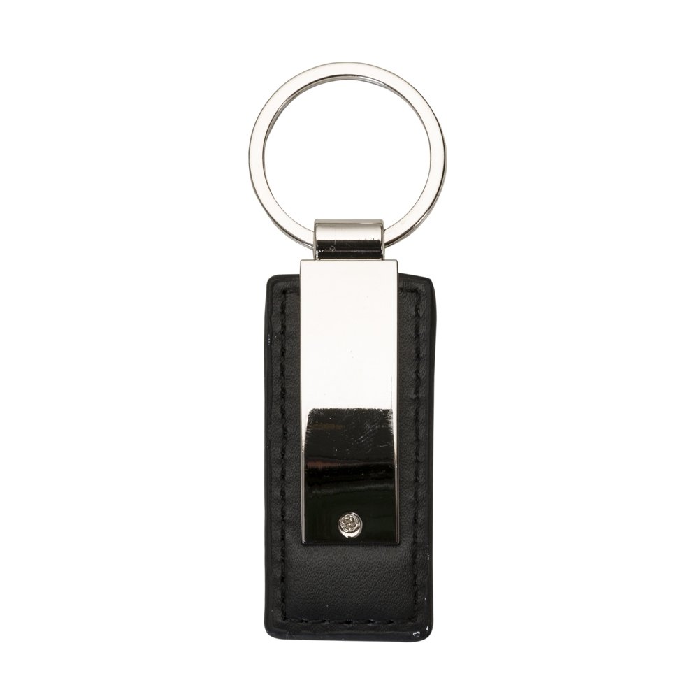 Chaveiro metálico brilhante com detalhe em couro sintético, área frontal lisa e verso com parafuso.