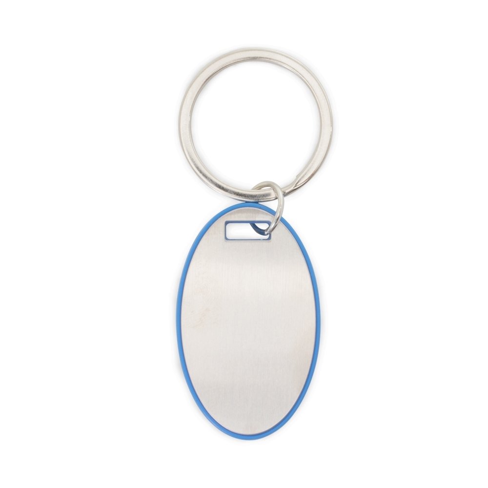 Chaveiro com detalhe plástico e chapa metálica, personalizável frente e verso.