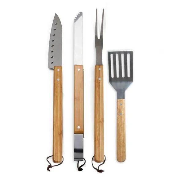 Conjunto em bambu/madeira/aço inox. Acompanha faca e garfo para churrasco, pegador e espátula perfurada em madeira/inox.