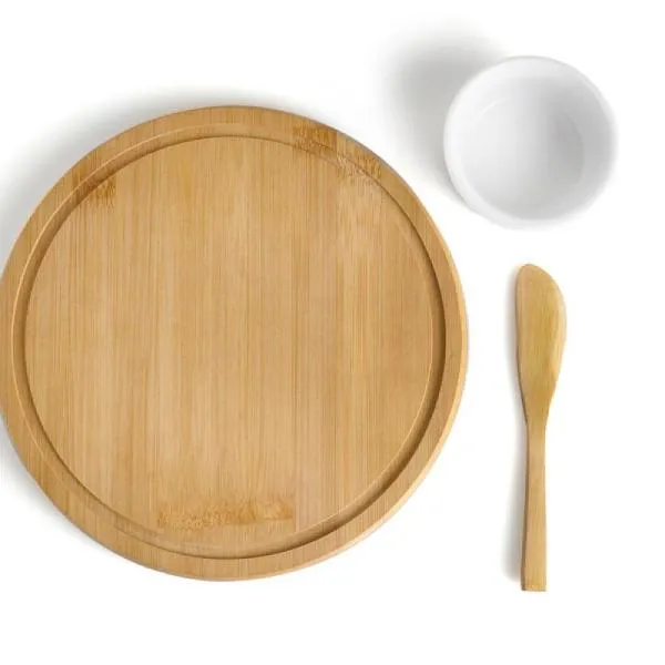Conjunto para petiscos em bambu. Acompanha tábua e espátula em bambu, conta também com ramekin em porcelana.