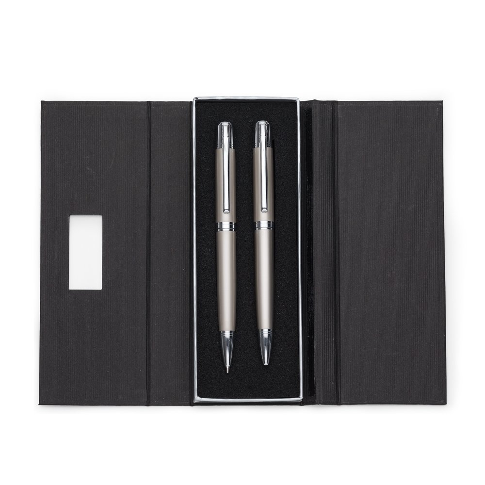 Conjunto caneta e lapiseira em estojo de cartonagem com placa central para personalização. Clip metal com dois anéis em relevo, anel centralizado e dois anéis em relevo na ponteira e acionam por giro. Estojo revestida com espuma na parte interna.