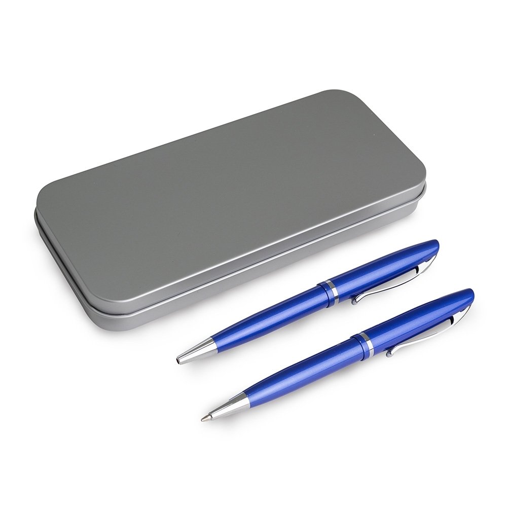 Conjunto de caneta e lapiseira metálicas em estojo metal. Caneta e lapiseira possuem acabamento brilhante, carga esferográfica azul de 1.0mm e acionamento por rotação.