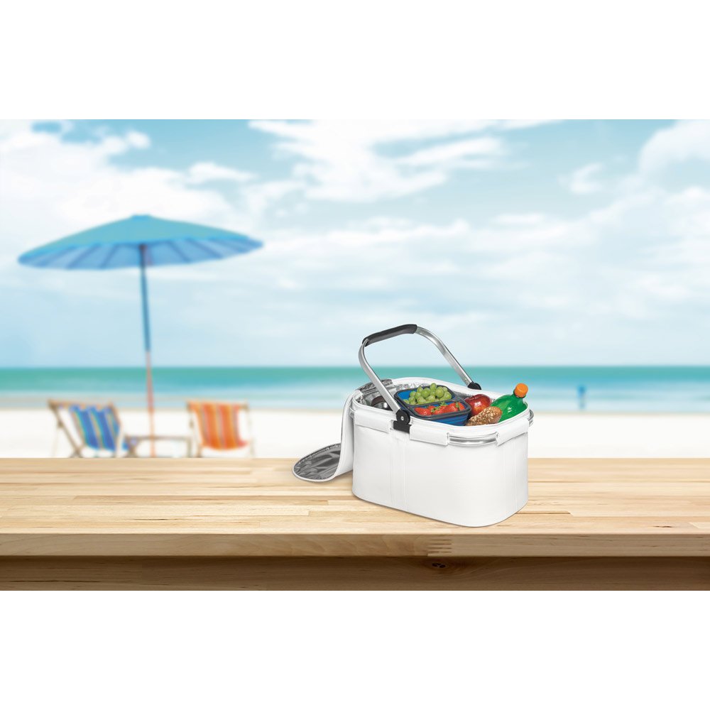 Sacola térmica flexível em 600D com zíper duplo e interior forrado. Estrutura removível em alumínio, com pega ergonômica em EVA. Capacidade até 25 L. Certificação EU Food Grade. 460 x 270 x 250 mm