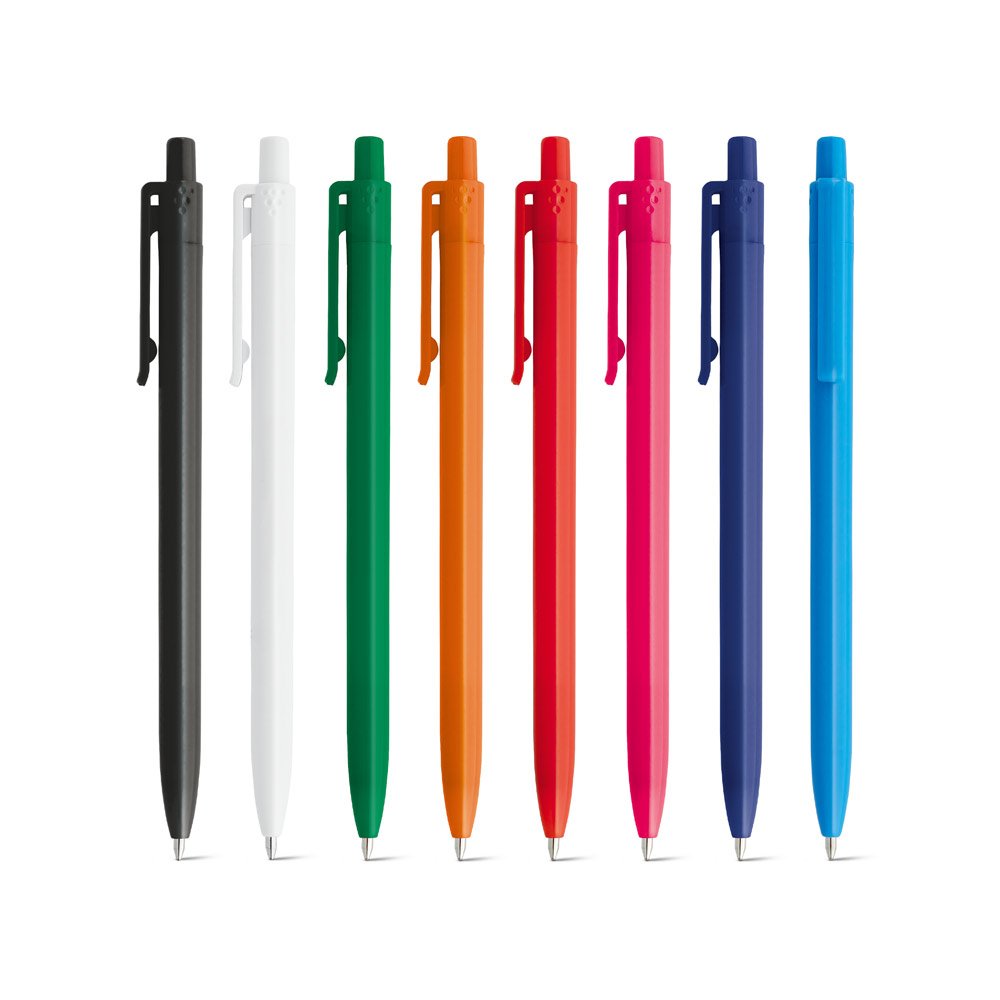Esferográfica em ABS com acabamento brilhante. Escrita em azul até 1.5 km. Produto certificado de acordo com a portaria Inmetro nº423 de 8/out/2021. ø9 x 140 mm