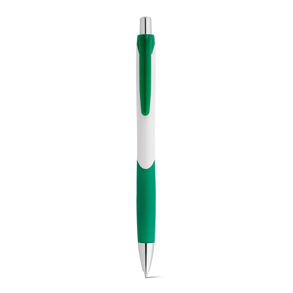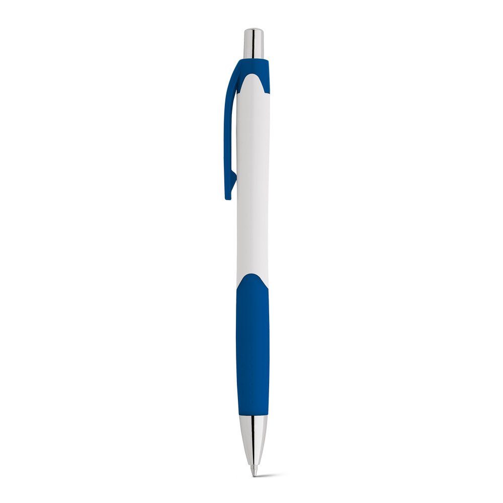 Esferográfica em ABS com grip, acabamento brilhante e ponteira cromada. Escrita em azul até 1.5 km. Produto certificado de acordo com a portaria Inmetro nº423 de 8/out/2021. ø11 x 140 mm