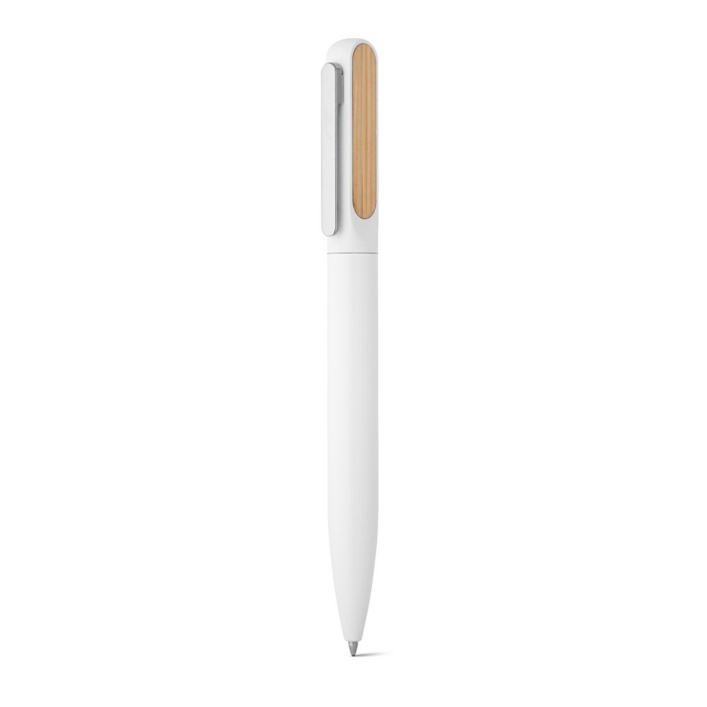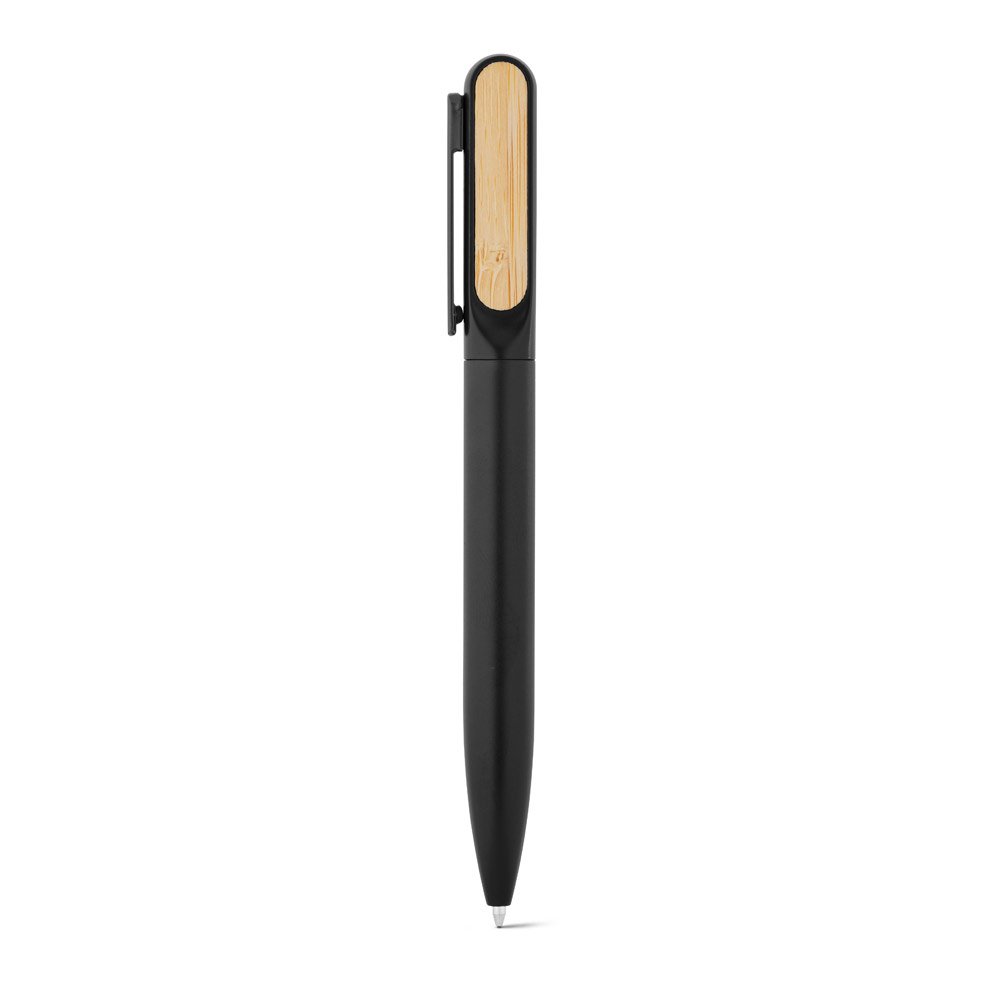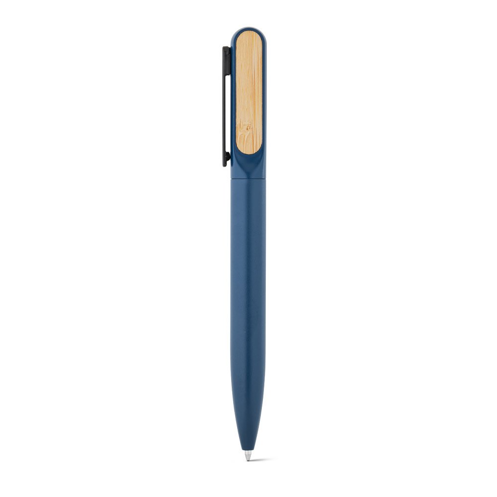 Esferográfica em alumínio 94% reciclado com detalhe em bambu no clipe. Escrita em azul até 1.5 km. Fornecida em bolsa de oferta. A cor e o resultado da impressão nos materiais naturais pode variar entre produtos. ø12 x 140 mm | Bolsa: 40 x 155 mm