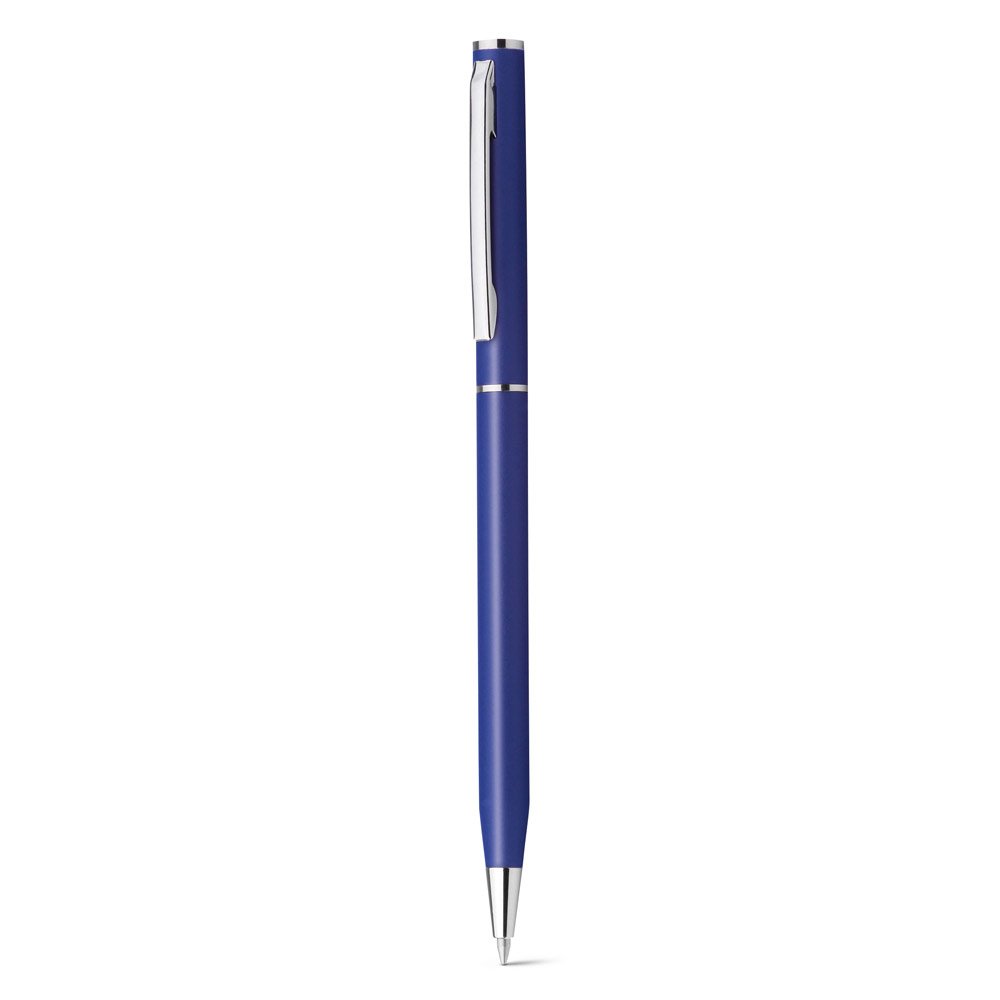 Esferográfica em alumínio com mecanismo twist e clipe de metal. Escrita em azul até 1.5 km. ø7 x 129 mm