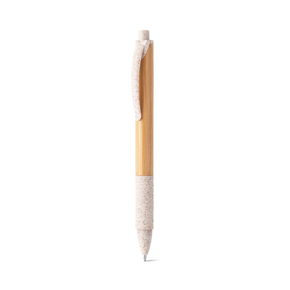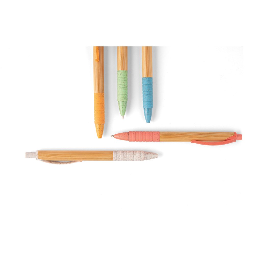 Esferográfica em bambu com clipe, antideslizante e elementos coloridos em fibra de trigo e ABS. Escrita em azul. A cor e o resultado da impressão nos materiais naturais pode variar entre produtos. ø11 x 142 mm