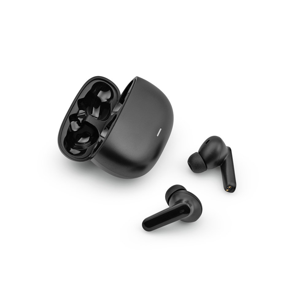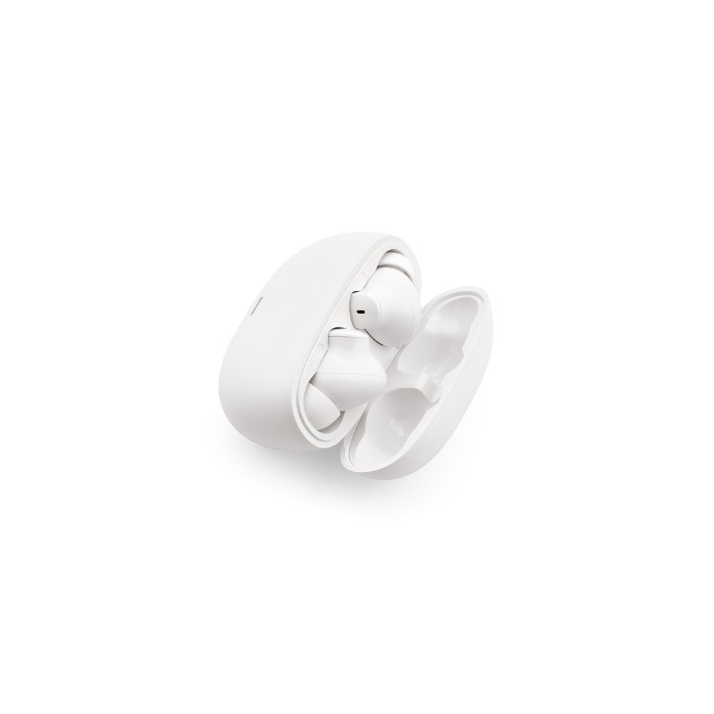 Fone de ouvido wireless em ABS 100% reciclado. Transmissão sem fios BT 5’3 com autonomia, aproximadamente, de 6 horas. Função para atender chamadas, controlo de volume e conexão à playlist do dispositivo móvel. Incluso cabo de carregamento USB-C e pares extra em borracha. Fornecido em caixa presente de papel kraft reciclado. Caixa: 75 x 150 x 45 mm