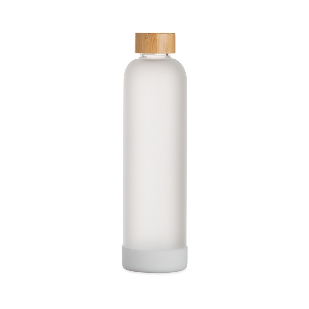 Uma garrafa com capacidade de 1 litro, feita em vidro borossilicato, conhecido pela resistência e durabilidade, capaz de suportar variações de temperatura, podendo ser levada à geladeira. Conta com tampa rosqueável de bambu e protetor anti-impacto removível em silicone.