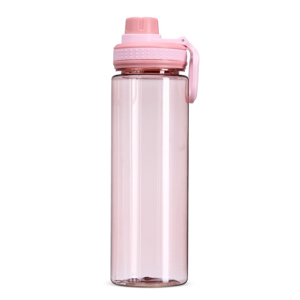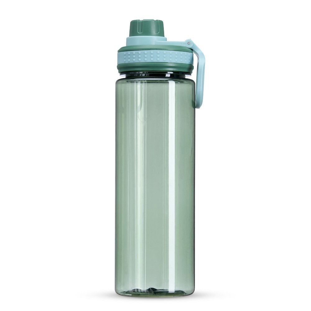 Garrafa plástica de 750ml com tampa rosqueável e bocal, tampa protetora e alça para facilitar o transporte.