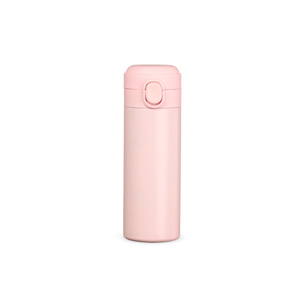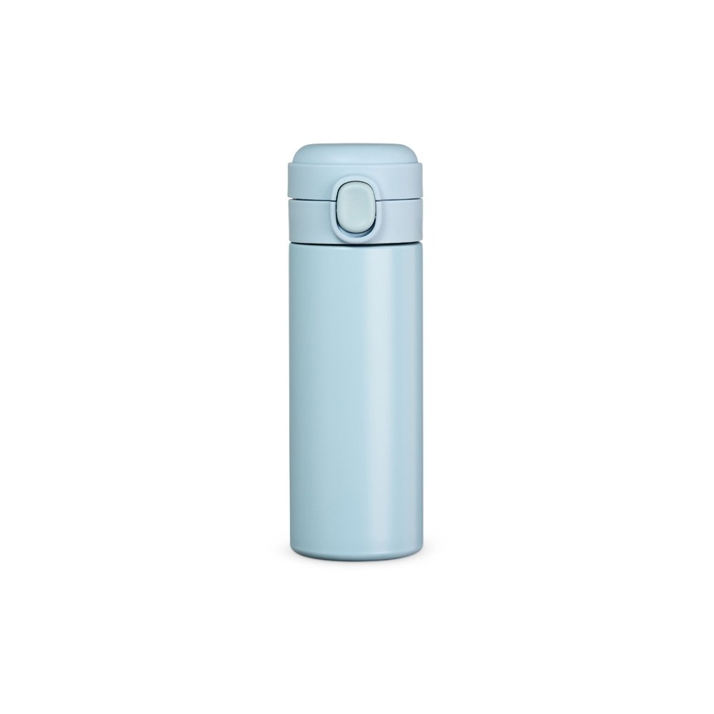 Garrafa térmica em inox com parede dupla, capacidade de 400ml. Tampa com botão central para abertura e borracha interna para vedação.