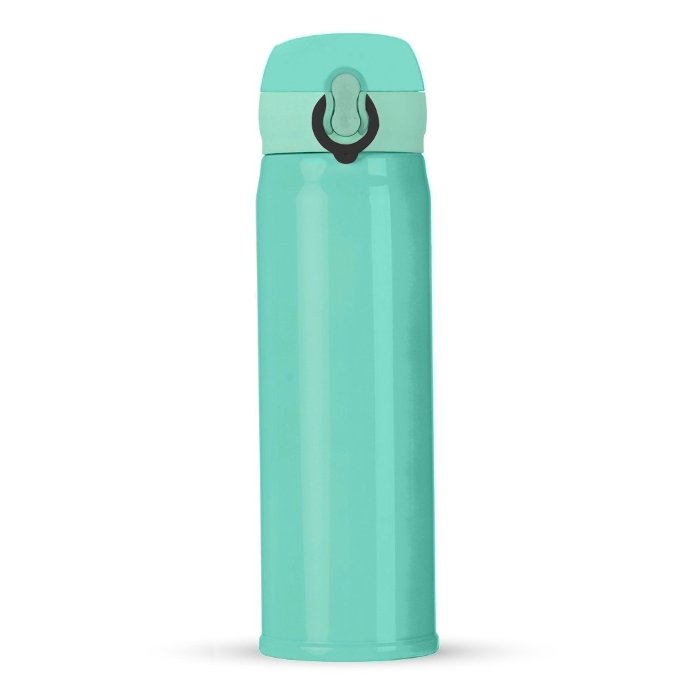 Garrafa térmica de 400ml de inox colorida com botão e válvula para abertura. Possui um sistema de trava (basta mover para cima/baixo para abrir/fechar), pressione o botão central para abrir a tampa(possui na parte interna borracha protetora evitando vazar o líquido). Para abrir a tampa por completo basta rosqueá-la, parte interna revestida em inox. Na embalagem do produto pode ir especificado a capacidade de 450ml ou 500ml devido aos fabricantes que trabalham terem impresso a descrição deste modo, porém ressalvamos a capacidade correta de 400ml.