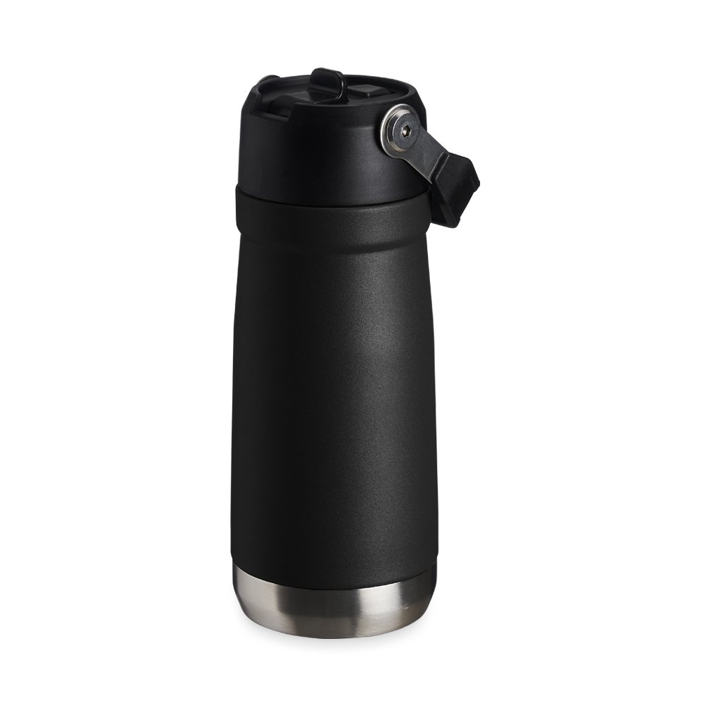 Garrafa térmica de parede dupla em inox, capacidade de 550ml. Tampa com alça de transporte, bico flip e canudo interno.