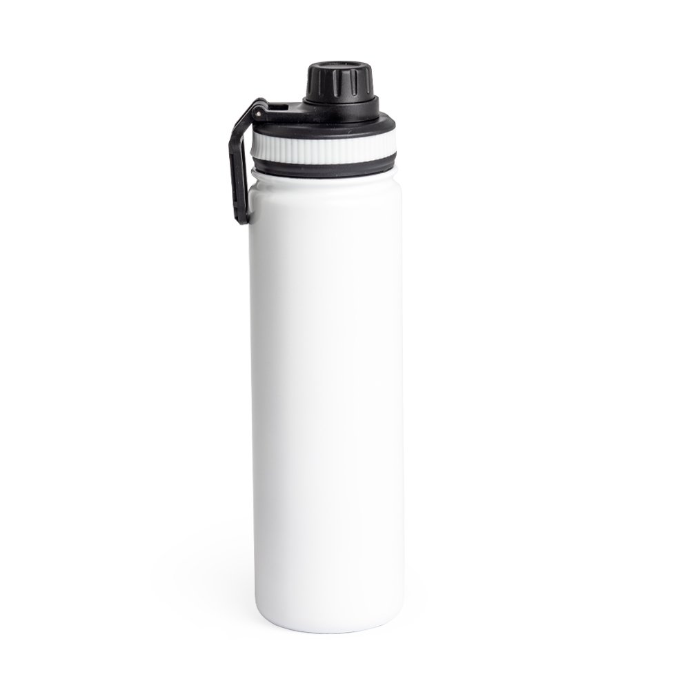 Garrafa térmica com capacidade de 650ml em inox com parede dupla, contém tampa plástica rosqueável com bocal e alça para transporte acoplados.