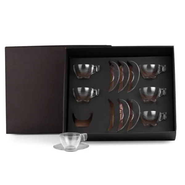 Jogo de xícaras. Kit para café contendo seis xícaras com pires em vidro. Capacidade: 90 ml cada xícara.