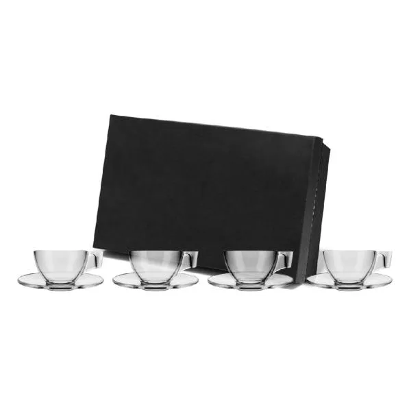 Jogo de xícaras. Kit para café contendo quatro xícaras com pires em vidro. Capacidade: 90 ml cada xícara.