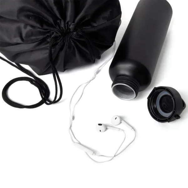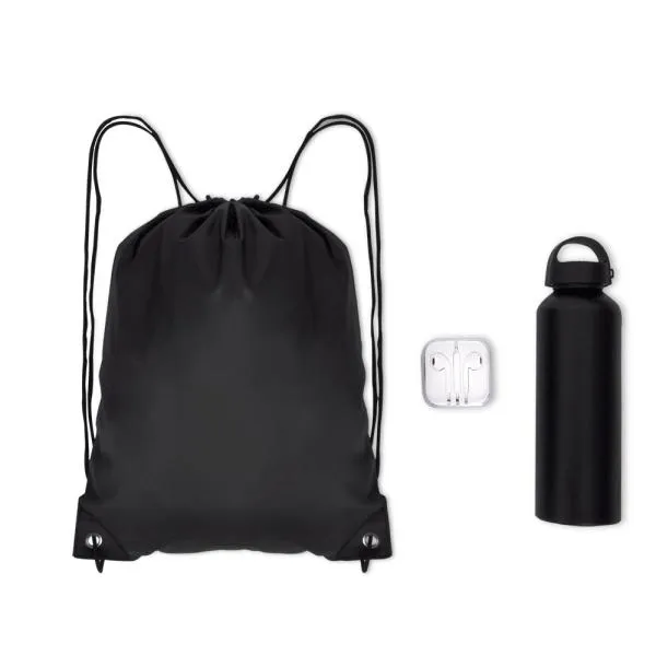 Garrafa branca em alumínio com capacidade de 600 ml; mochila sacola preta em Nylon 190D com alças ajustáveis e fone de ouvido branco com microfone, controle de volume e estojo plástico.