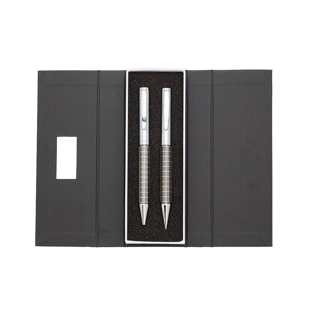Kit caneta e lapiseira de metal em estojo papelão com placa de metal(parte interna do estojo revestida com espuma). Caneta e lapiseira prata com detalhes coloridos e quadriculados, clip metal com anel superior na ponta e dois anéis centrais e acionam por giro.