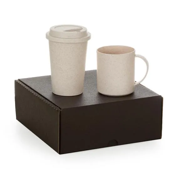 Kit caneca e copo. Conta com caneca e copo em fibra de bambu/PP. A caneca conta com alça para melhor uso e o copo com tampa e abertura para beber o líquido.