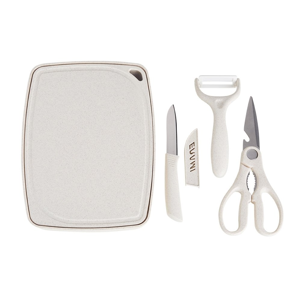 Kit Cozinha 3 Peças em plástico de palha de trigo e inox. Contém tesoura culinária, faca com protetor e descascador de legumes. Acompanha bandeja e tampa, podendo ser utilizada como recipiente e tábua para corte.