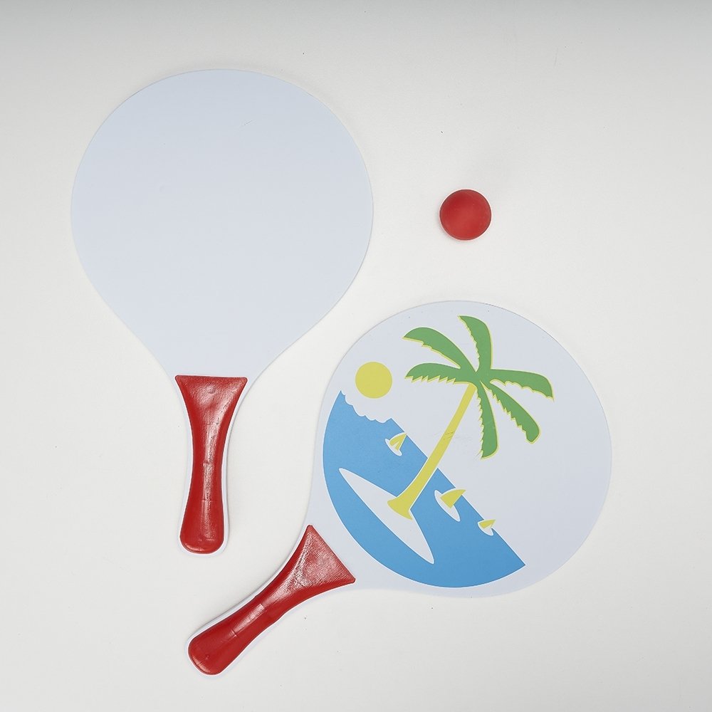 Kit frescobol em MDF com embalagem de malha plástica. Contém 2 raquetes de madeira com pegador de revestimento plástico e bolinha emborrachada.