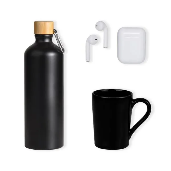 Conta com garrafa, caneca em cerâmica preta com capacidade 230 ml e fone de ouvido Bluetooth.
