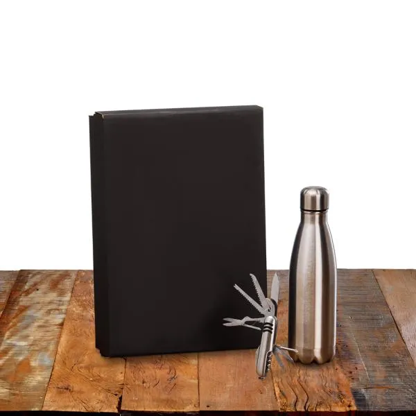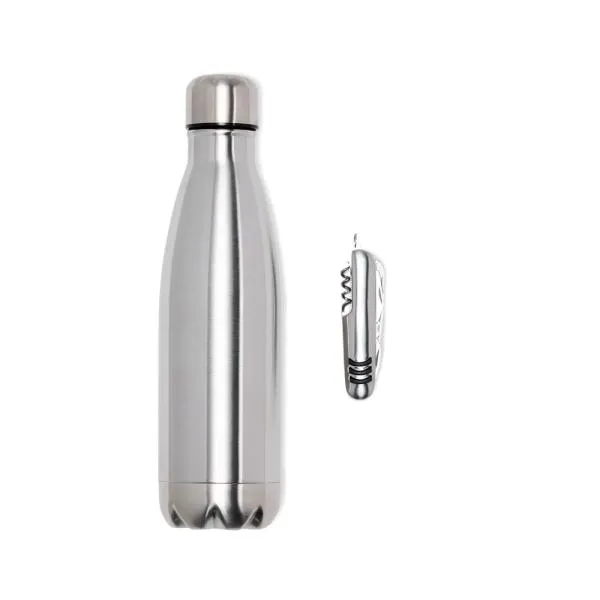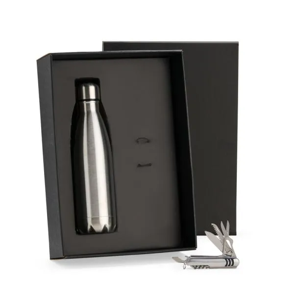 Composto por garrafa em Aço Inox prata com tampa rosqueável e canivete confeccionado em aço Inox escovado e três detalhes externos emborrachados nos dois lados.
