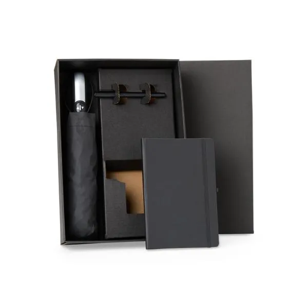 Kit guarda-chuva, caderno e caneta. Composto por guarda-chuva confeccionado em Nylon 190T na cor preta com ativação automática ao pressionar um botão, tanto para abrir quanto para fechar, empunhadura confortável com elástico para fixar no pulso, diminuindo o risco de queda e aumentando a segurança. Conta também com caderno para anotações preto com capa dura e caneta roller em alumínio com tampa preta.