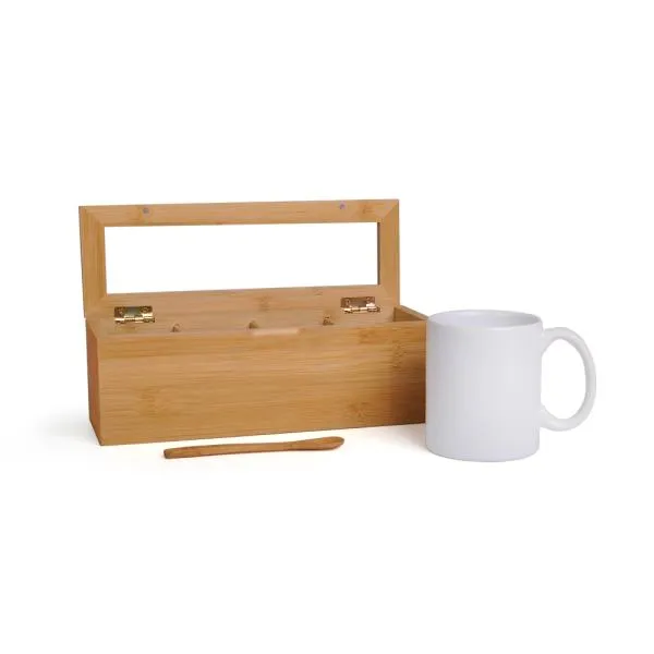 Composto por Caixa para chás em Bambu/Poliestireno; colher de 13 cm em Bambu e caneca em cerâmica branca. Não acompanha chás.